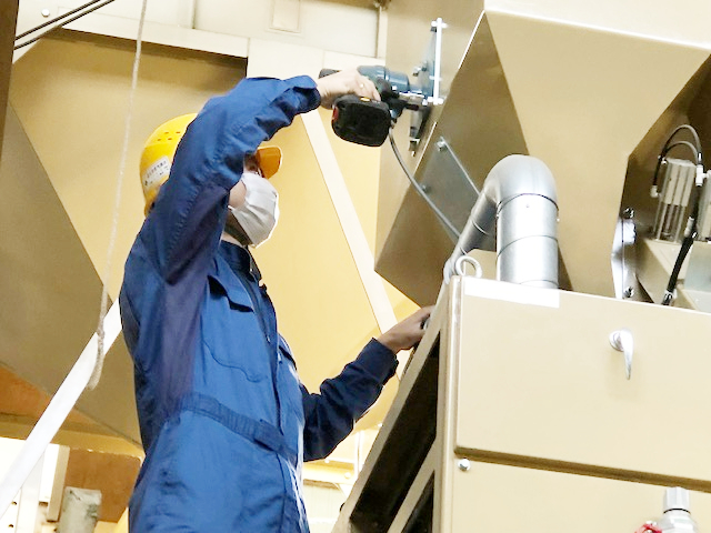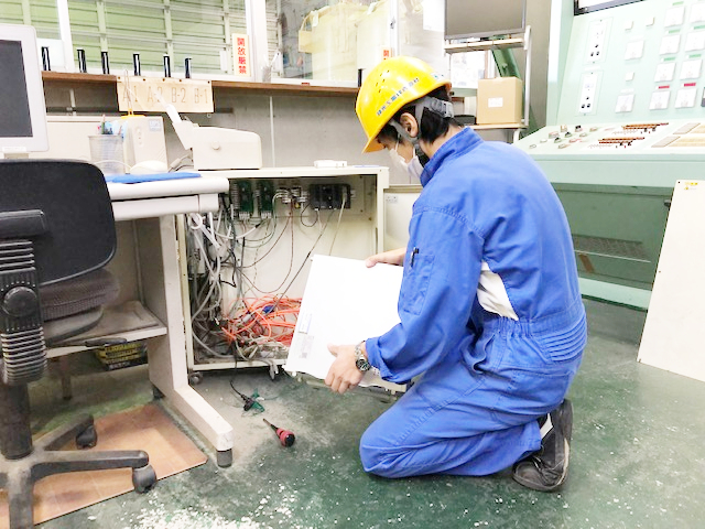 機械修理や点検もエンジニアセールスの業務の一つです。自社製品を深く知ることに繋がり、営業にも役立っています。